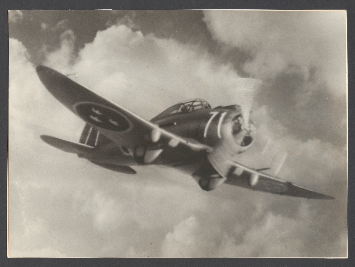 Bild av flygplan Seversky P-35 under flygning. Bilden samlades i av Evert Ingemansson, förmodligen i samband med hans utbildning till eldledare under luftvärnsskjutningar 1938-1939.