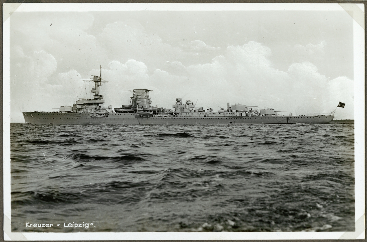 Titel: Vykortet visar den tyske kryssaren Leipzig till havs.