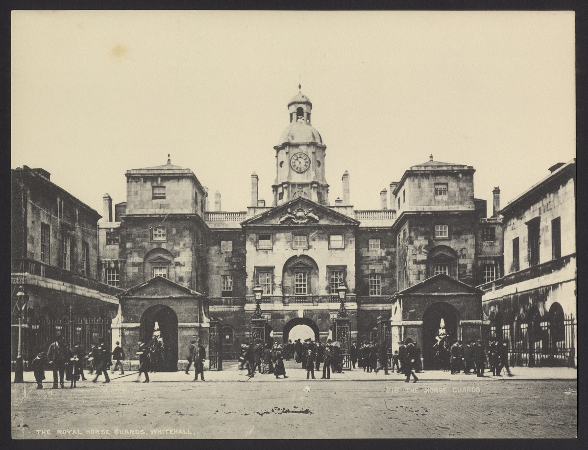 Titel: Bilden visar The Royal Horse Guards i London. Platsen framför byggnaden är befolkat av passanter.