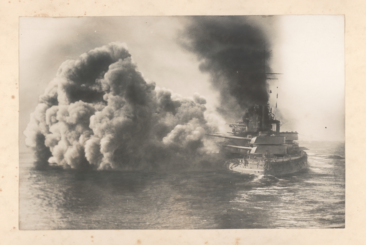 Titel: Bilden visar den tyska stora slagskepp Kaiserin som skjuter en bredsida under Skagerakslaget.