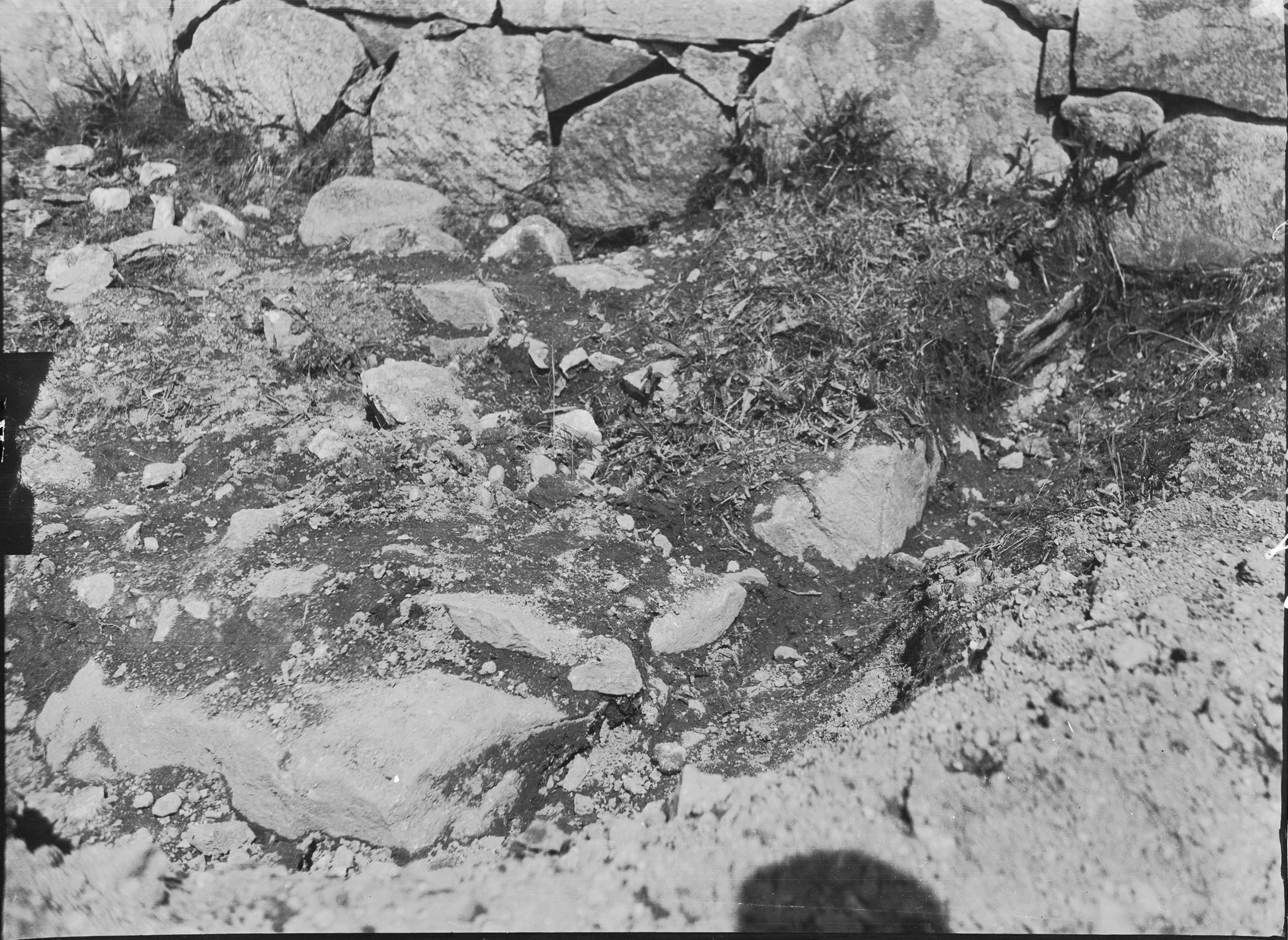Södra murens västra del, utanför kyrkogårdsmuren, med sydvästra hörnet, mot sydväst.