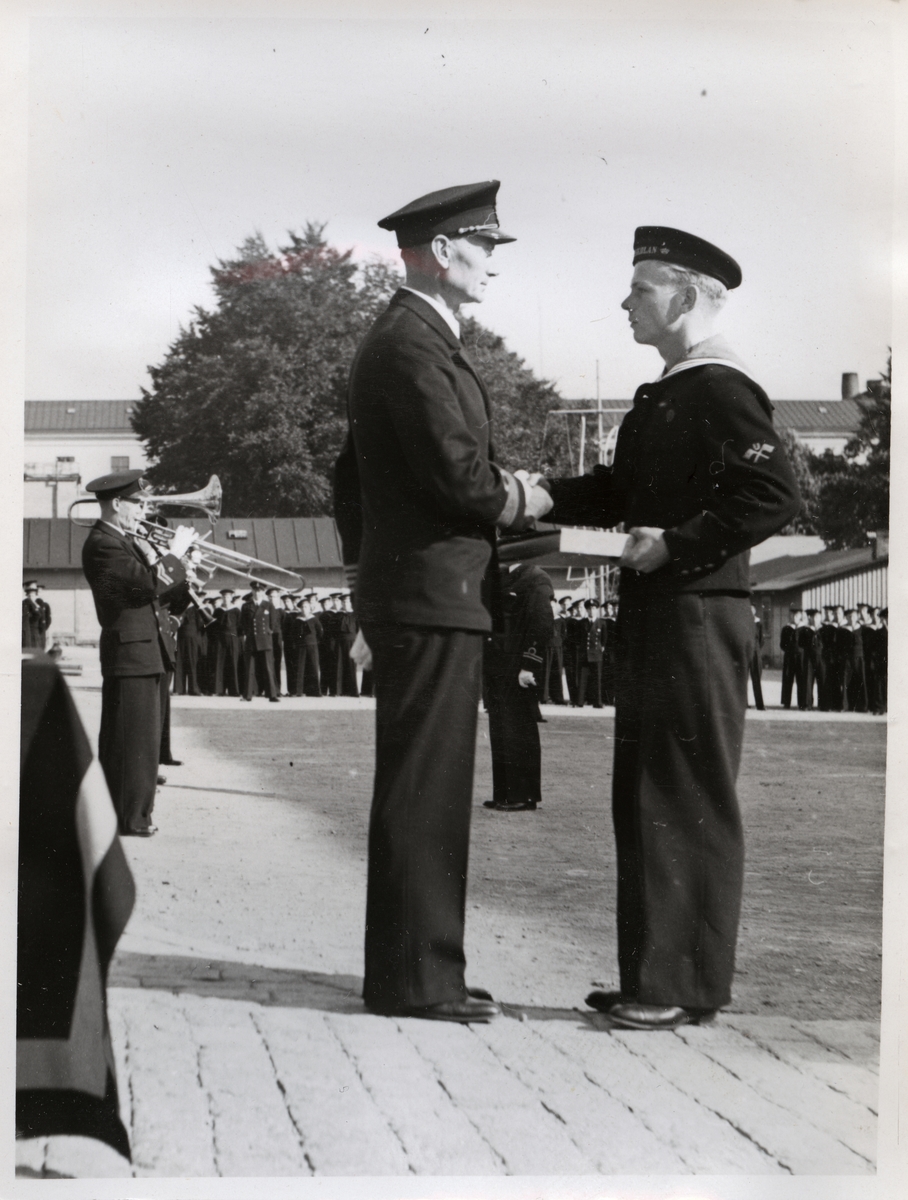 Värnpliktig mottager medalj av officerare och skakar hand i cermoni medan marinkårens musiker spelar. I bakgrunden syns andra värnpliktiga och befäl. I bilden syns en trumpet/trombon?