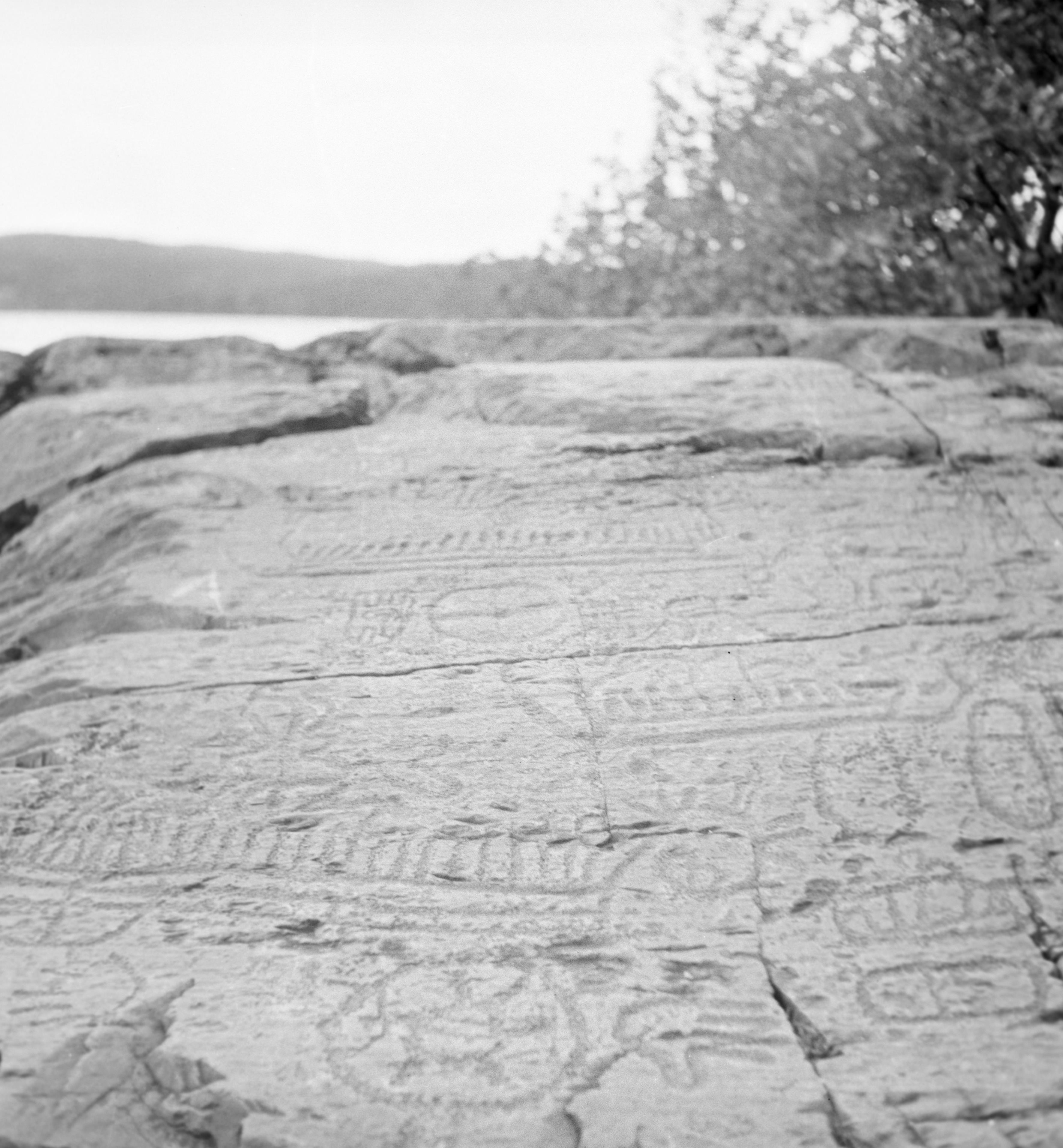 RAÄ-nummer Tisselskog 15:1. "Framsidans" sydligaste del, Ronarudden, sjön Råvarpen. På bilden bl a handfigurer, fotsulefigurer och skeppsbilder.