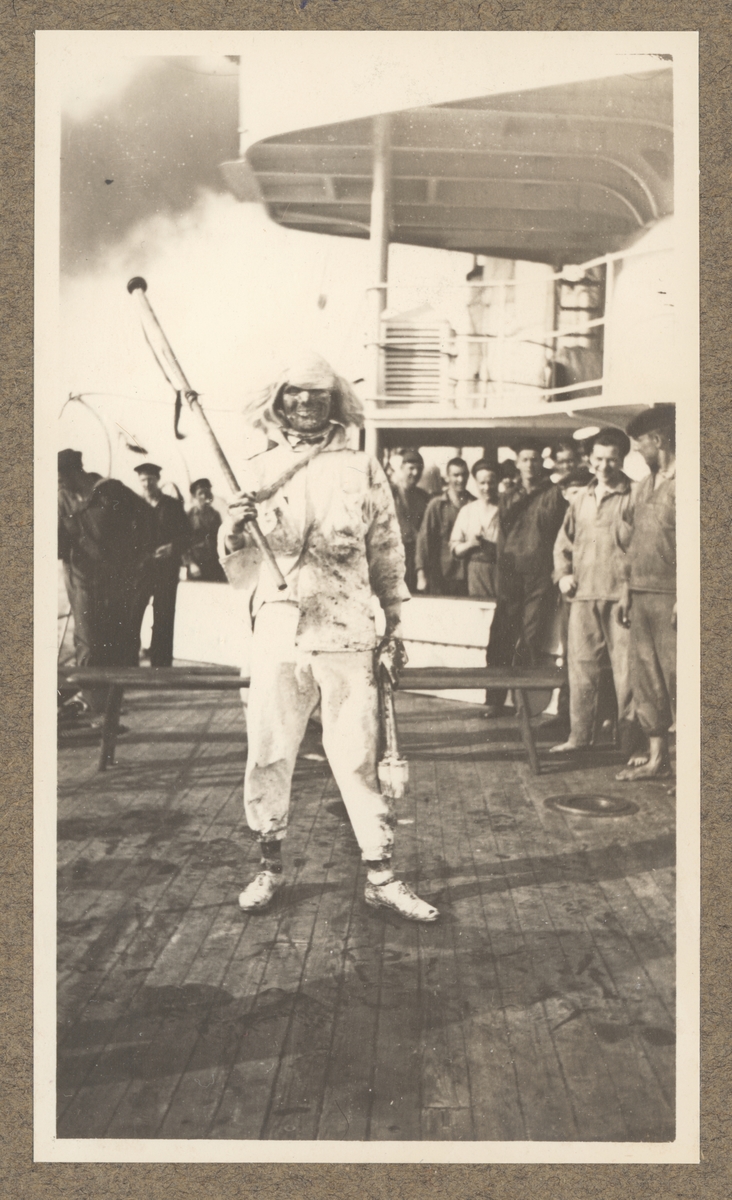 Titel: Bilden föreställer utklädd sjömän under linjedopet ombord på Fylgia.