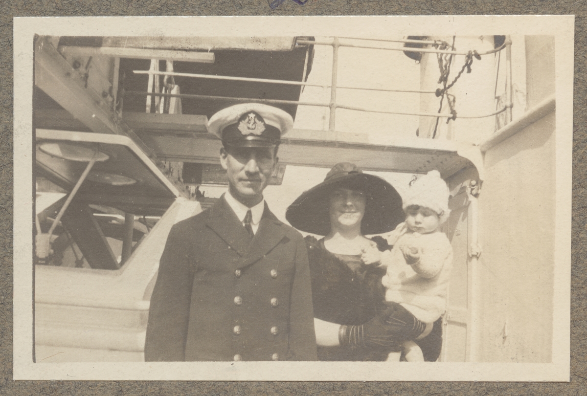 Titel: Bilden visar en sjöofficerare med kvinna och barn ombord på Fylgia.