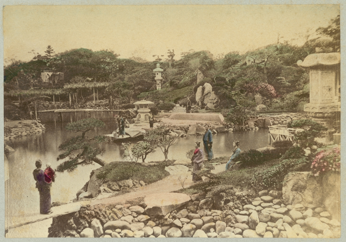 Bilden visar en Daichini-do trädgården i staden Nikko i Japan. I trädgården syns ett flertal japaner i traditionella dräkter.