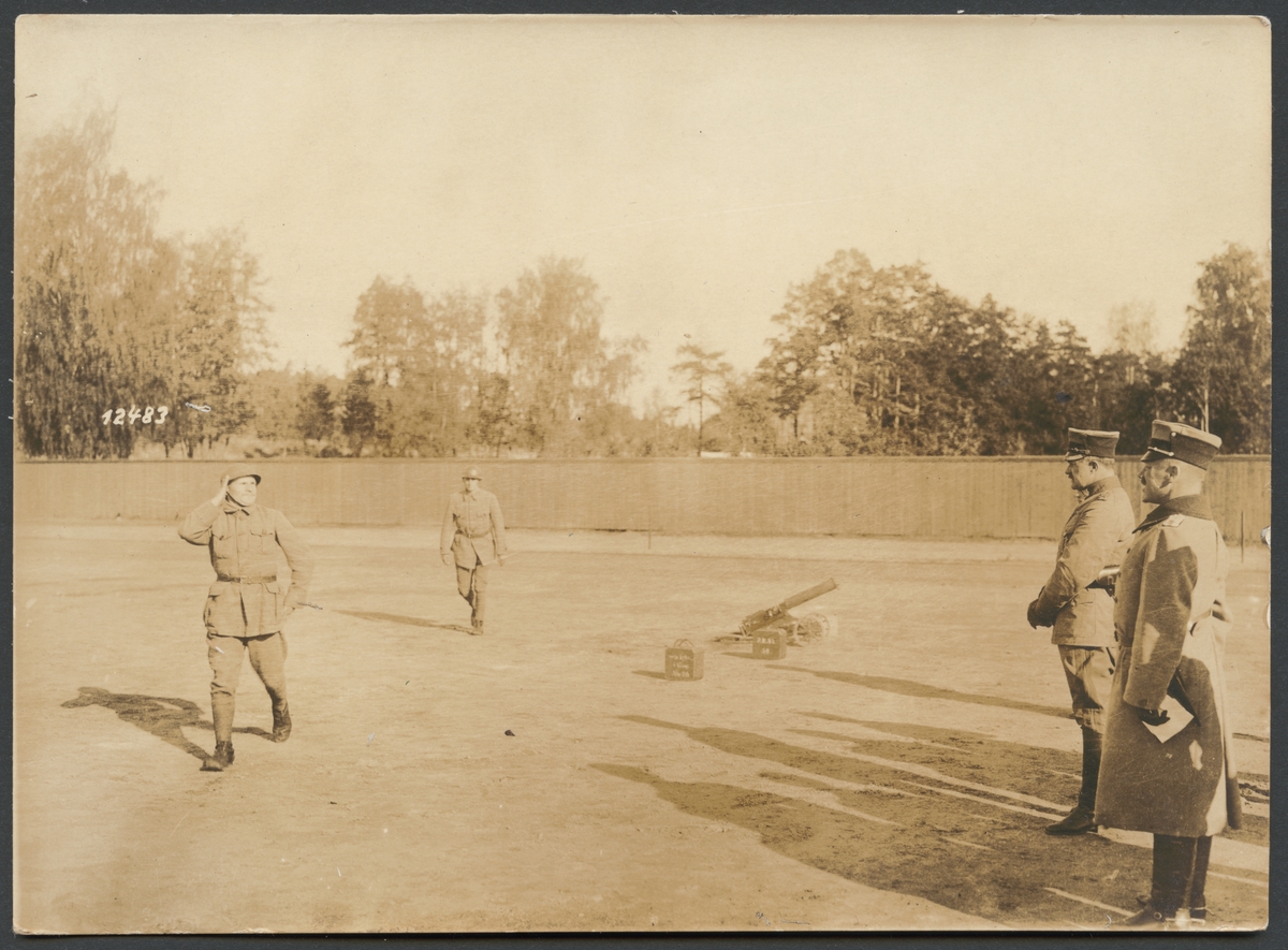 Bilden visar soldater av en kulspruteavdelning under utbildning. Kulsprutan är monterat på en liten lavett med hjul. En soldat passerar förbi på två officerare och hälsar militärt.