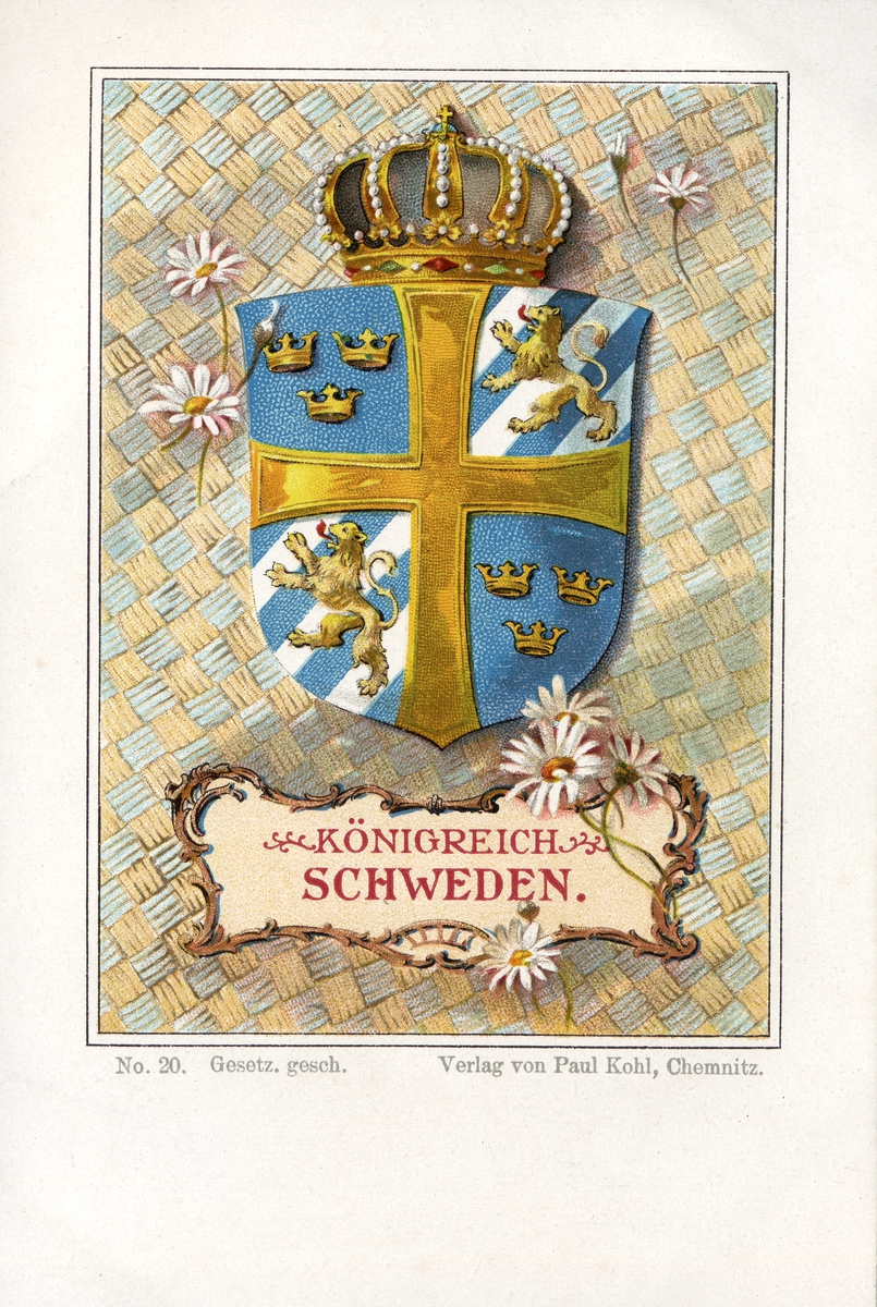 Vykort med Sveriges vapensköld och påskrift "Kungariket Sverige" på tyska.
