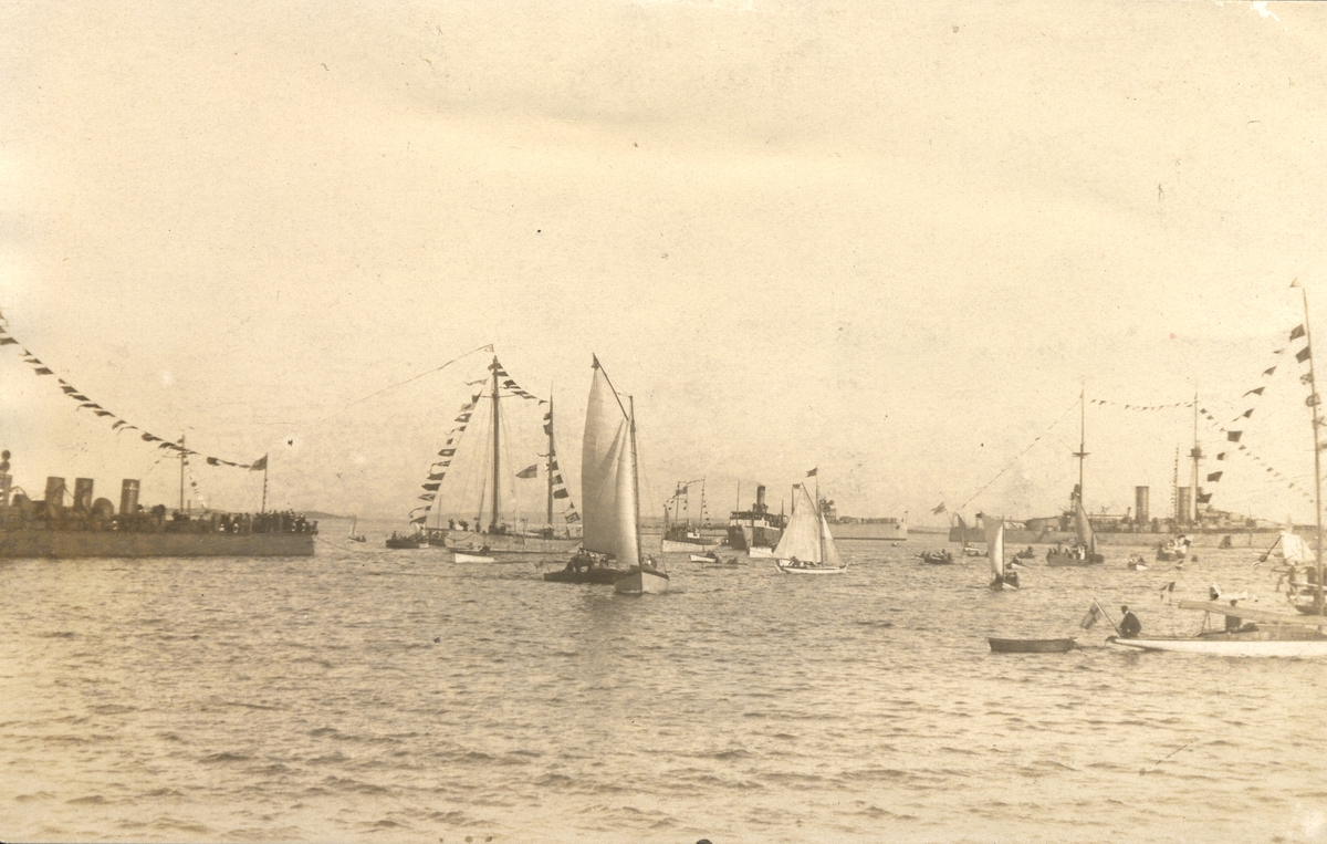 Titel: Vykort över barkar och segelfartyg.