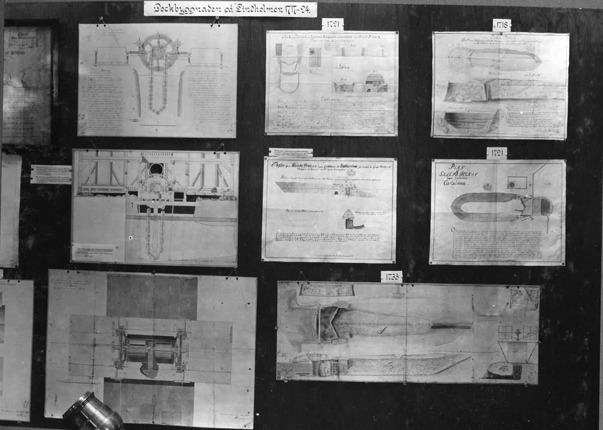 Titel: Fotografi över utställda ritningar från Polhemsdockan.