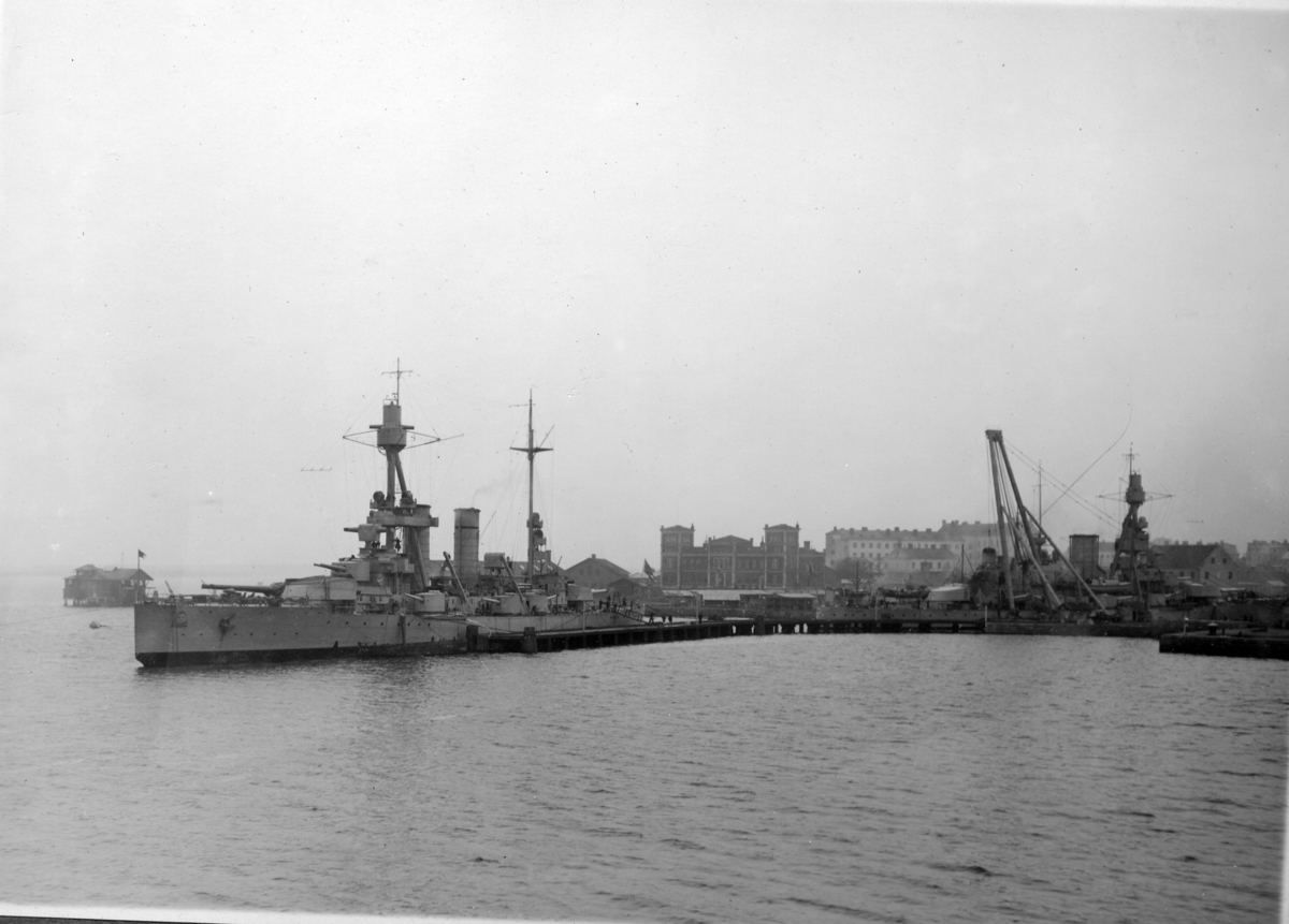Titel: Pansarskeppet Drottning Viktoria vid utrustningspiren Pansarskeppet Gustav V i bakgrunden.