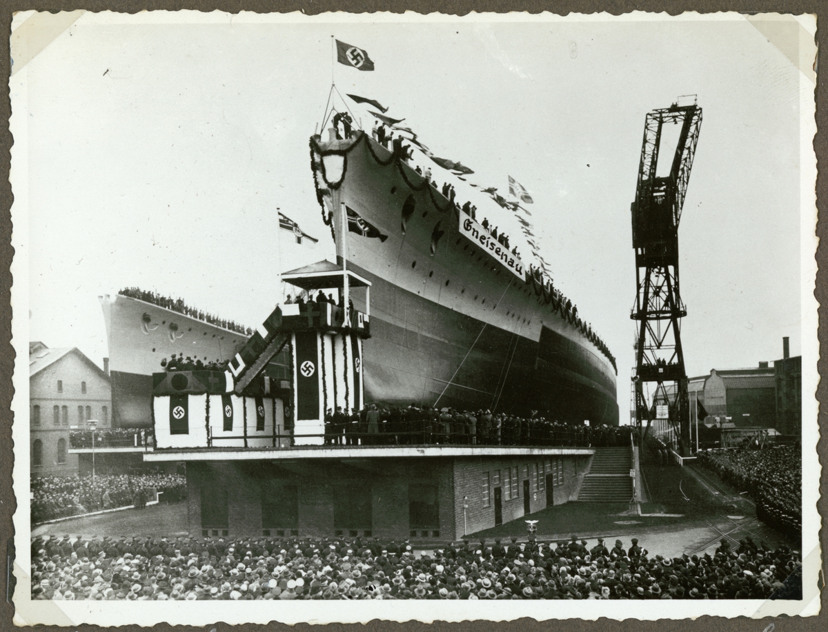 Sjösättning av slagskeppet Gneisenau 8 december 1936 på Tyska varvet i Kiel. Skeppet på bädden vi sidan om Gneisenau är den tunga kryssaren G, som vid sjösättningen blev döpt till Blucher.