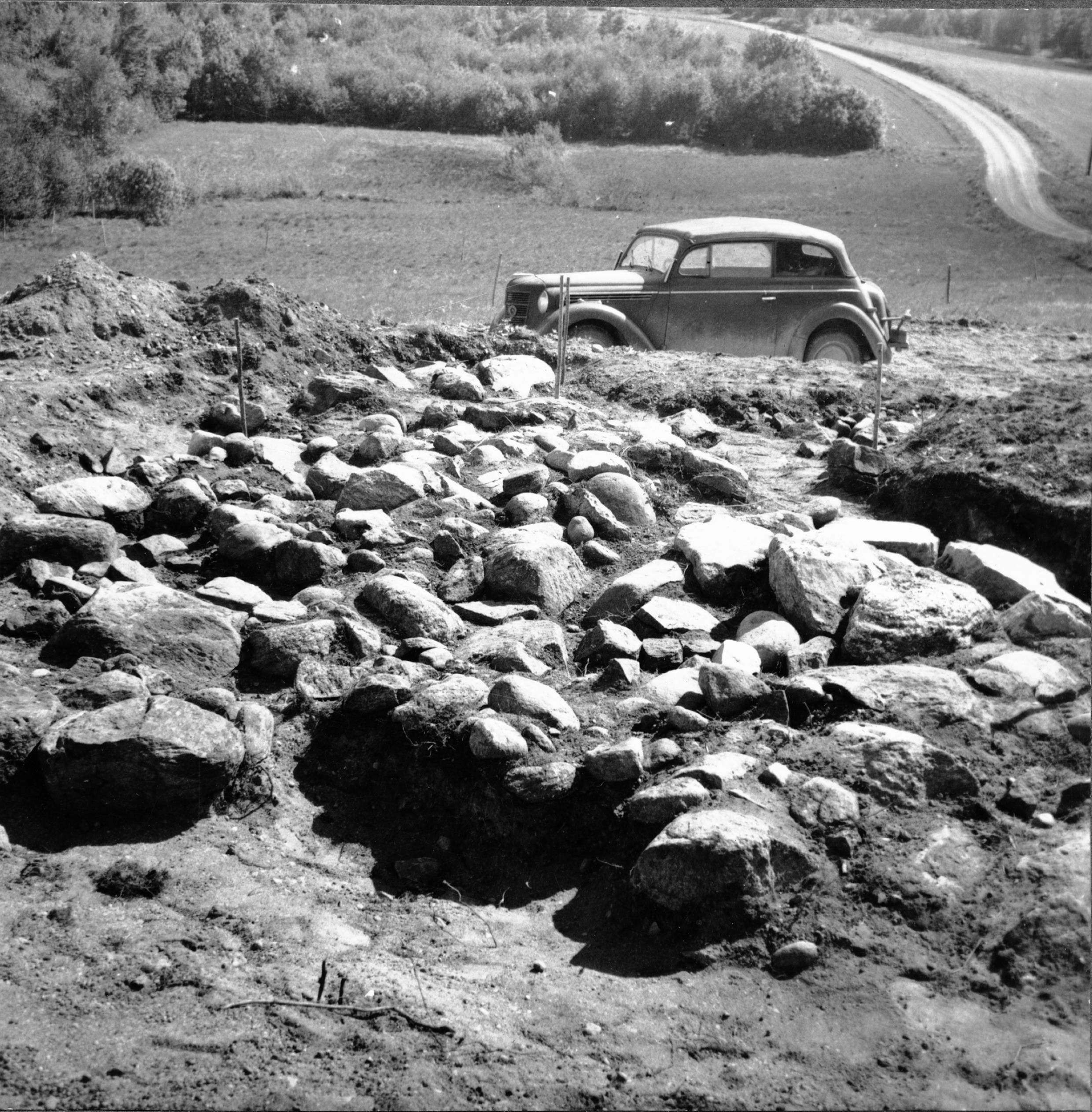 Kyrkans grundmurar under utgrävning. Korparti från väster. Triumfbågens öppning i förgrunden.