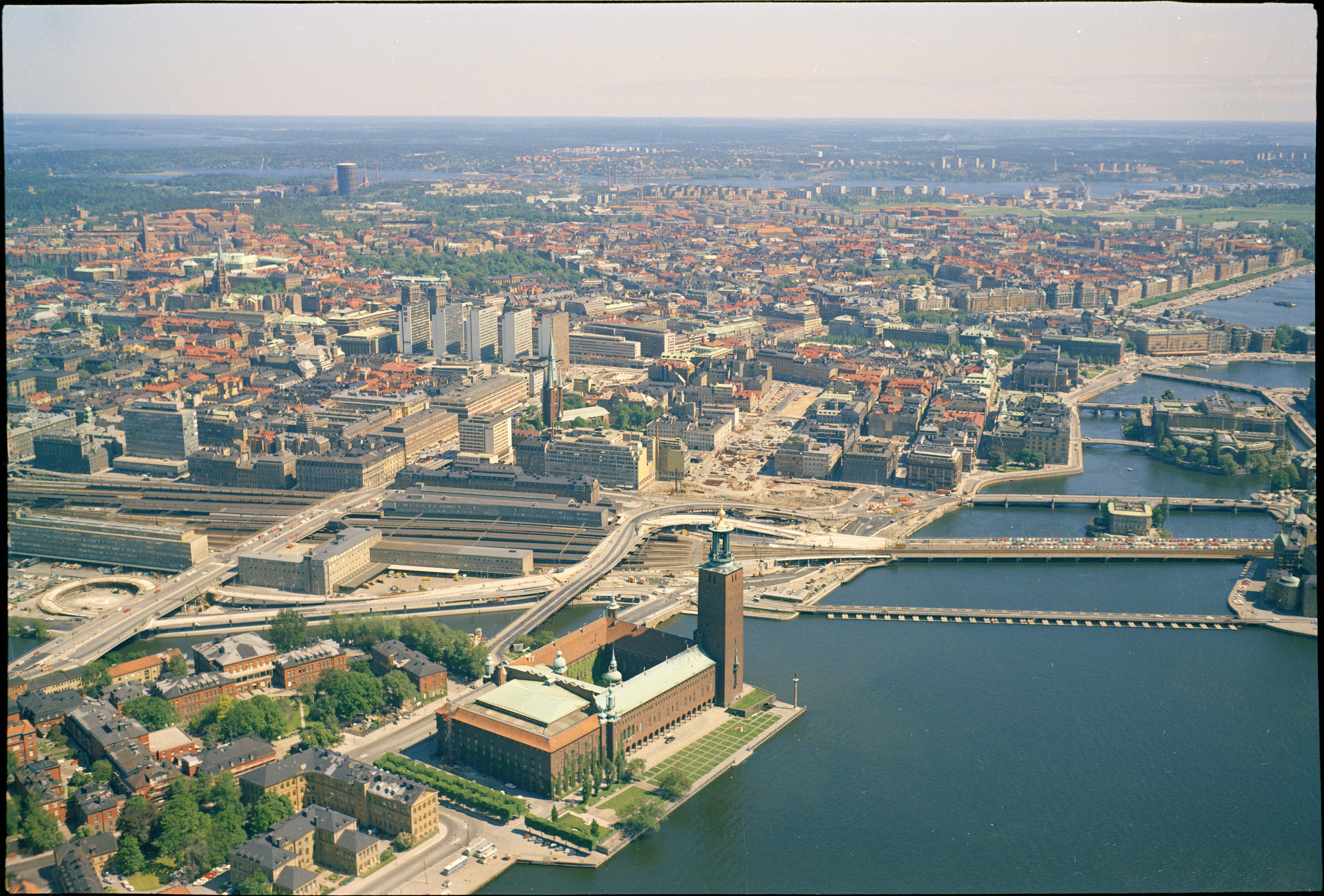 Stockholm City mot öster med Stadshuset och Centralstationen i förgrunden. Rivningar.