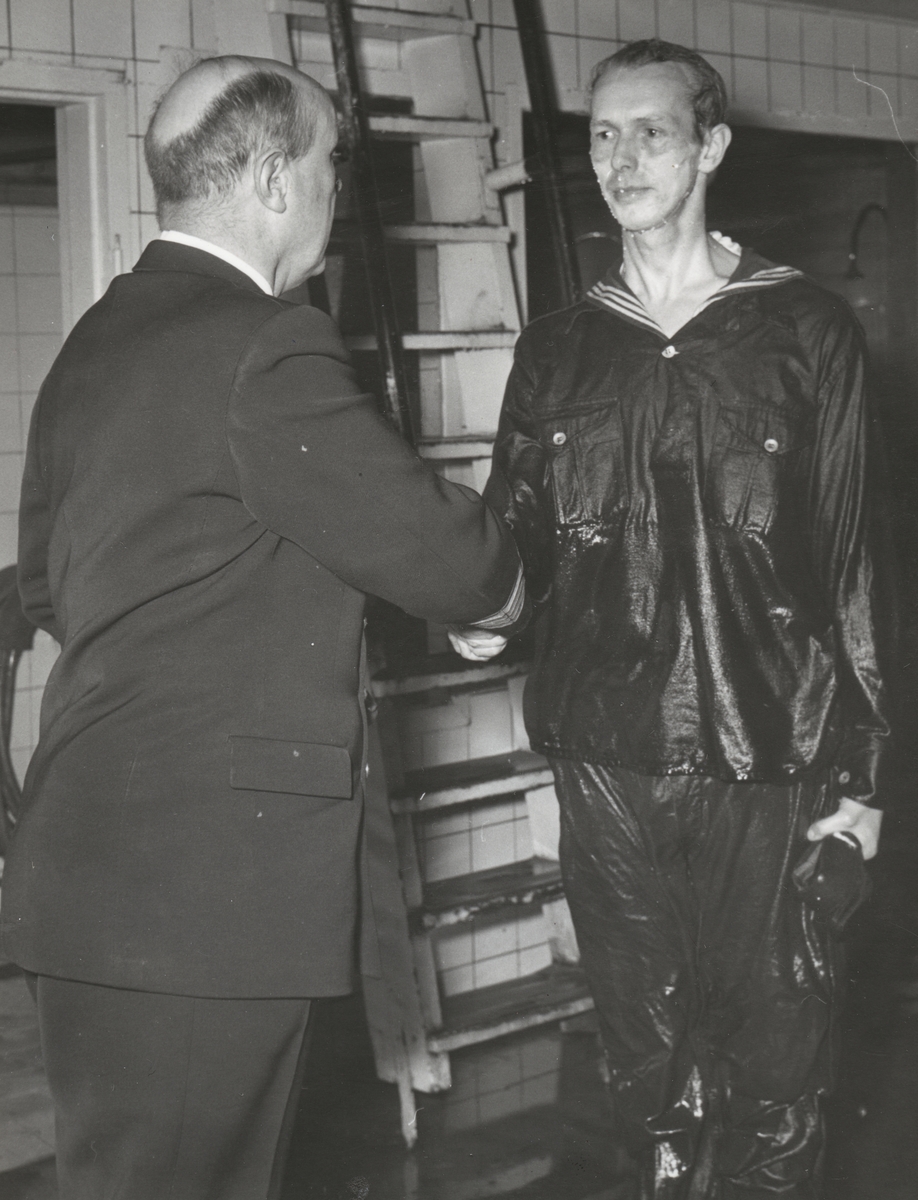 En matros i blöta kläder efter utfört klädsim hälsar på man vänd med ryggen mot fotografen. Bakom de står en lejdare (stege).
