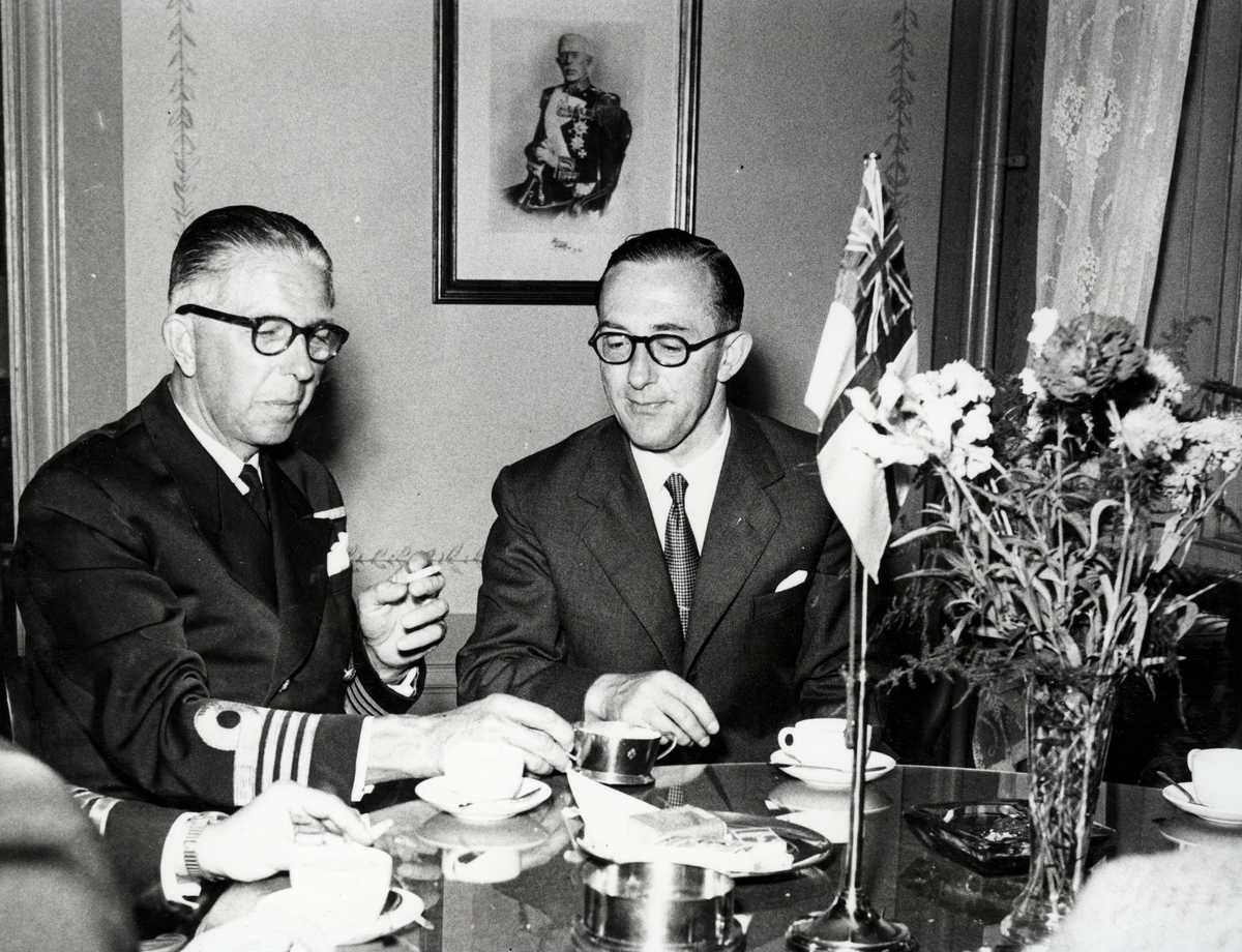 En kommendör klädd i uniform sitter bredvid en civilklädd man vid ett bord. På bordet står en blomvas, ett askfat, kaffekoppar och en flagga för Storbritanniens royal navy.