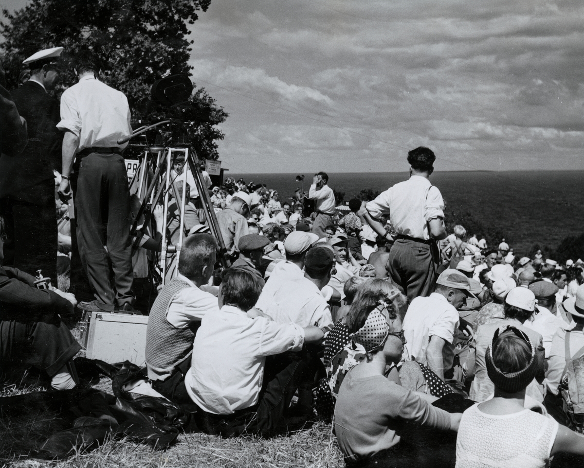 Folksamling sitter på gräsbeklädd sluttning och ser ut över havet som skymtar i höger bakgrund. Två män, varav den ena uniformsklädd, står vid en kamera på stativ. Bilden är tagen i samband med "Operation kullen" 1955.