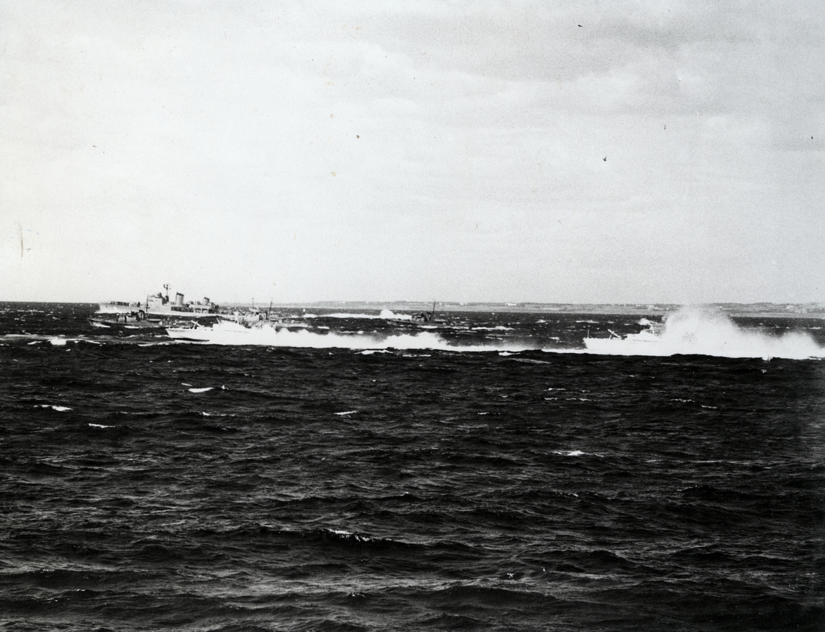 Titel: Flera militära fartyg framförs i Skälderviken. Bilden är tagen i samband med "Operation kullen" 1955.