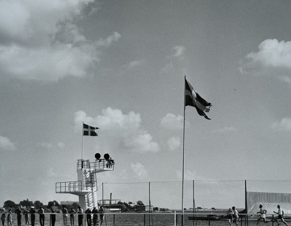 Träning på Stumholmen. Tre män springer medan en mindre folksamling står lutade mot ett staket och betraktar. Två män sitter på hopptornets översta avsats. I bakgunden skymtar Basareholmen. Bild från Marinmästerskapet i allmän idrott.
