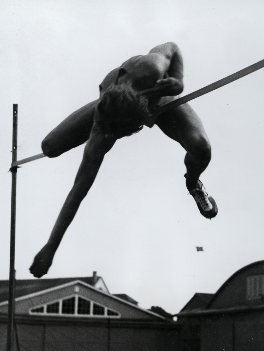 Titel: En idrottsklädd man fångad på bild mitt i ett höjdhopp. Bild från Marinmästerskapet i allmän idrott.