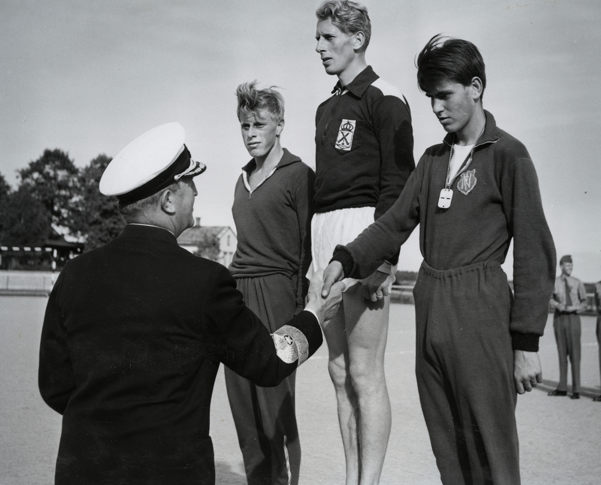 Konteramiral Johan Erik Samuelson tar en ung, idrottsklädd man i handen under en prisutdelning. Bredvid den yngre mannen står ytterligare två idrottsklädda män. Bild från Marinmästerskapet i allmän idrott.