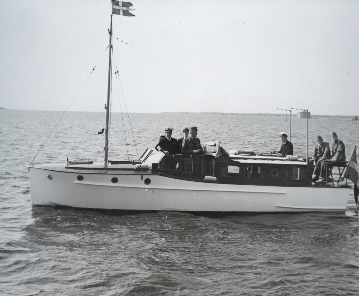 Konteramiral Samuelson färdas i en mindre båt tillsammans med en grupp uniformsklädda militärer. I bakgrunden skymtar befästningstornet Godnatt.