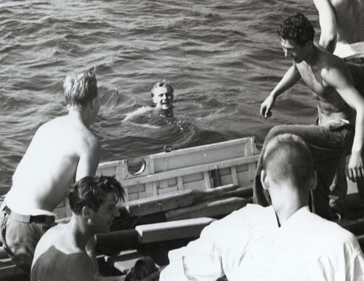Titel: Styraren kastas "över bord" av segrarna från en roddbåt. Åtminstone fem män sitter eller står i båten.