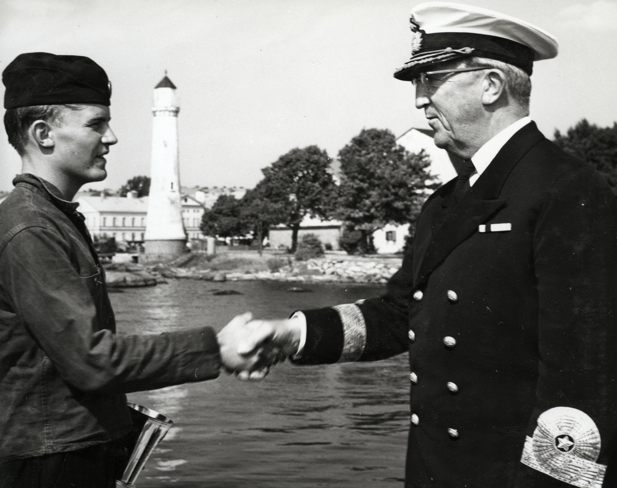 Konteramiral Johan Erik Samuelson står till höger i bild i uniform och skakar hand och ger gratulationer till en ung man från F1SS styrare med en prispokal i handen. I bakgrunden skymtar Stumholmen och fyren Karlskrona nedre.