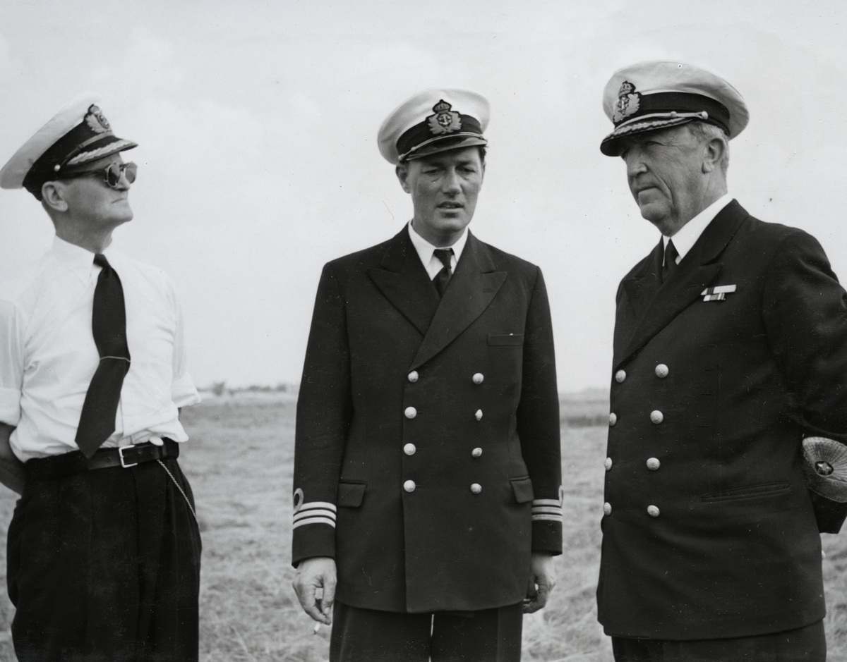 Konteramiral Johan Erik Samuelson står uniformsklädd tillsammans med en kapten och en högre militär officer på en äng.
