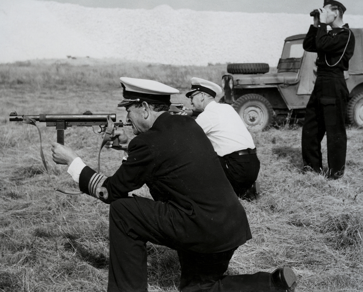 Två uniformsklädda militärer, den ena kommendör, sitter på ett knä på en gräsyta och siktar med skjutvapen. Bredvid dem står ytterligare en uniformsklädd man som tittar i en kikare. I bakgrunden syns ett militärfordon.
