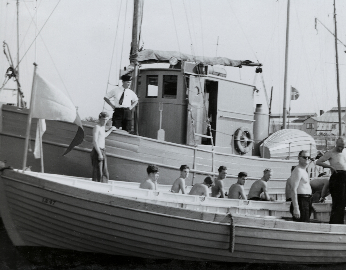 Barbröstade män sitter och står i två mindre båtar. Bakom de mindre båtarna finns en något större båt i vilken det står en uniformsklädd man.