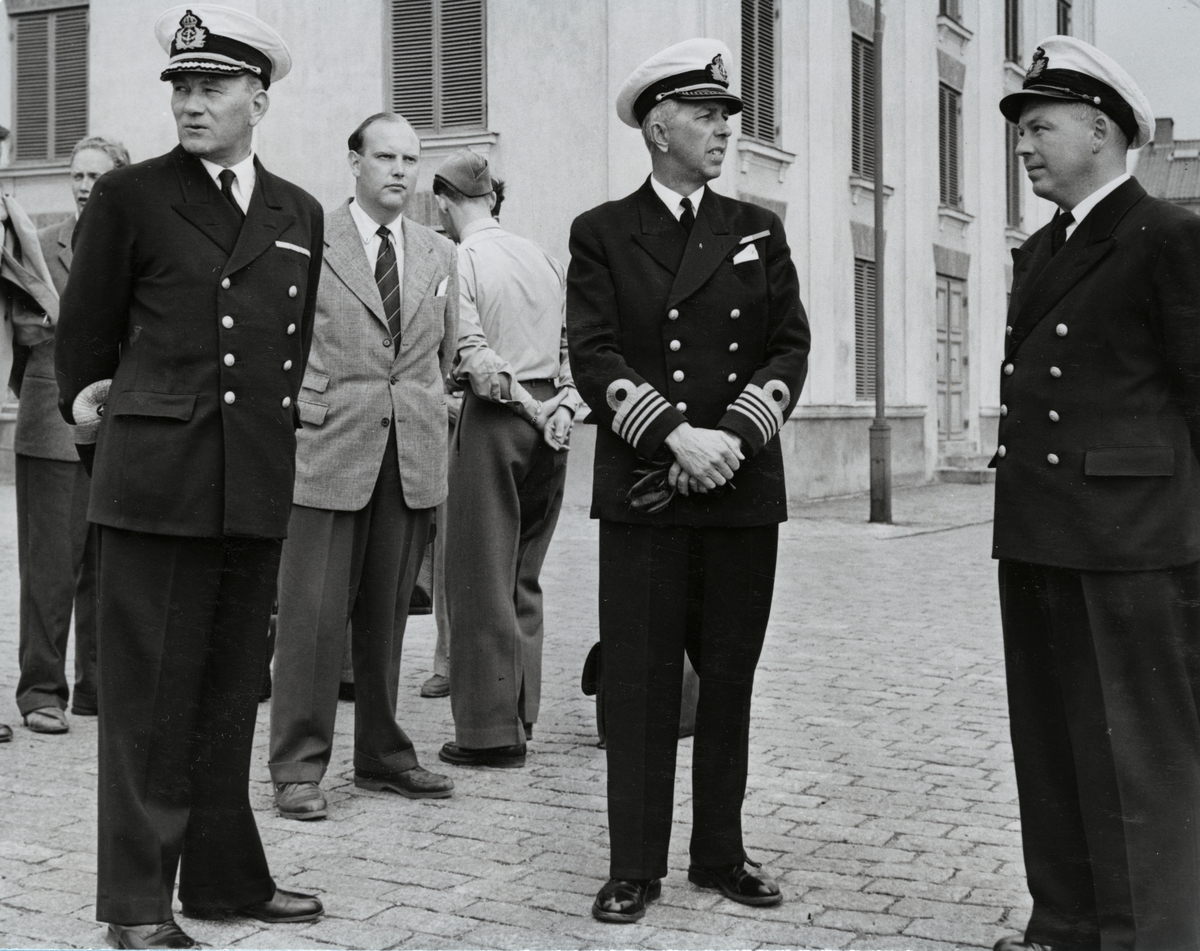 Konteramiral Berthelsson (till vänster) står ute på en gata tillsammans med två militärer, varav den ena är kommendör. Bakom dem står några civilklädda människor tillsammans med en uniformsklädd man. I bakgrunden syns en byggnad med putsad fasad.