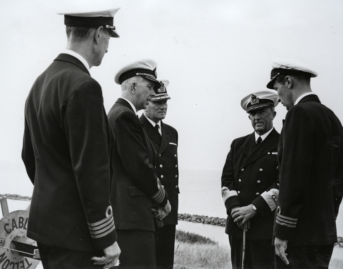 Konteramiral Samuelson (andra från höger) och konteramiral Berthelsson (i mitten) står tillsammans med en grupp uniformsklädda militärer. Gruppen består utöver Samuelson och Berthelsson av en kommendör, en kommendörkapten av första graden och en kapten.