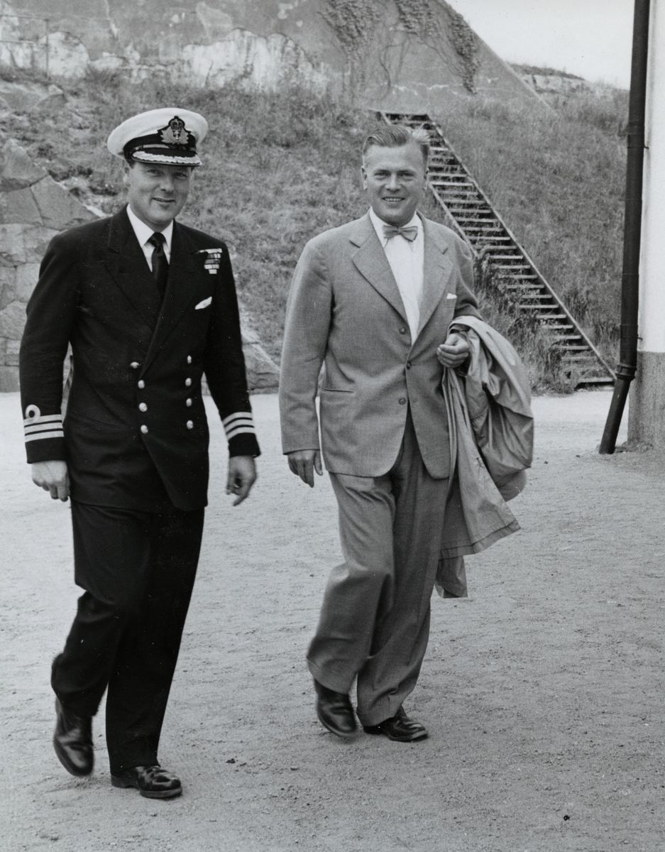 En kaptensman i uniform syns gåendes tillsammans med en uppklädd civilklädd man. I bakgrunden syns en trätrappa leda upp för en gräsklädd vall med en byggnadsstruktur ovanpå.