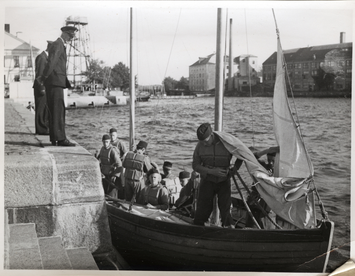 Bilden visar en segelbåt med besättning som ligger vid kaj. Besättningen iordningställer båten innan/efter segling; samtliga är yngre män och de är klädda i sjömanskläder och i livvästar.Längst fram vid fören står två matroser och tar ner stagfocken under ett befäls översyn. Befälet befinner sig uppe på kajen och strax bakom honom står ytterligare ett befäl, båda till vänster i bild. I bakgrunden syns matinrättningen till vänster och till höger ses beklädnadsförrådet (äv. Kronobageriet) och beklädnadsverkstaden på Stumholmen.