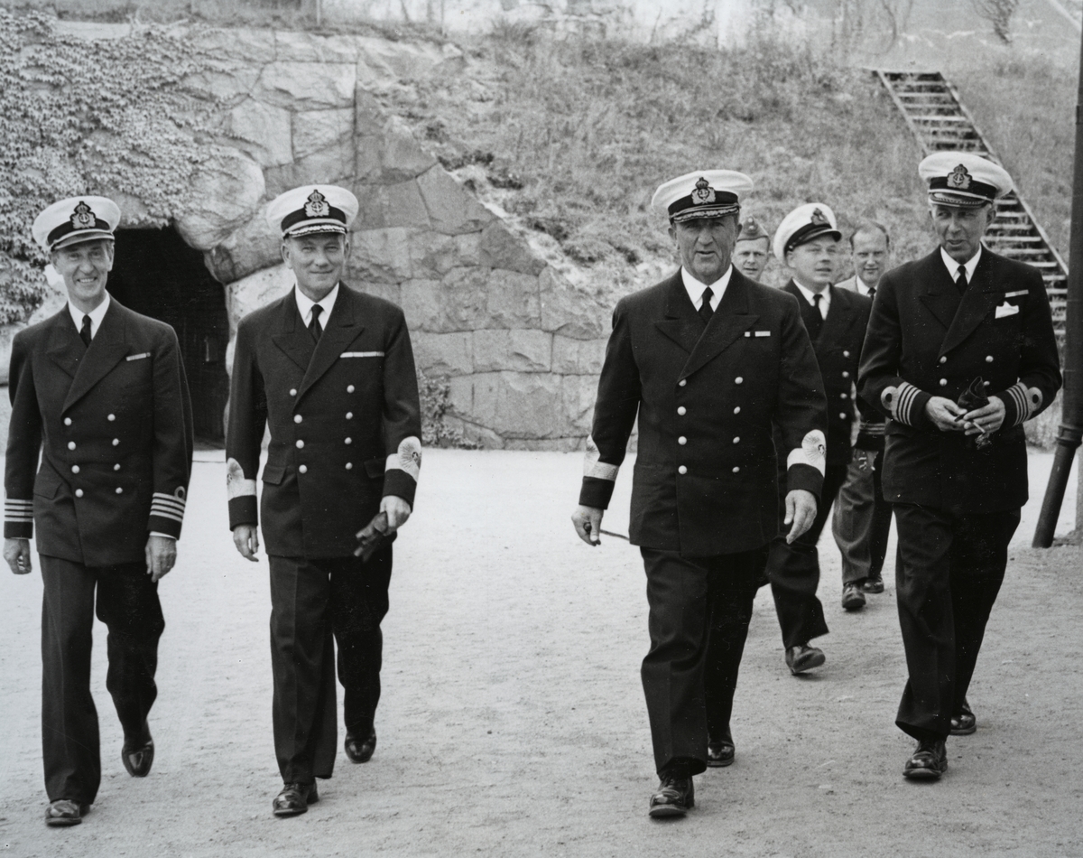 Konteramiral Samuelson går på en grusväg tillsammans med en grupp män från militären, alla utom en klädda i militära uniformer. I gruppen finns utöver Samuelson bl.a. konteramiral Berthelsson, en kommendör och kommendörkapten av första graden Bengt Lind af Hageby.