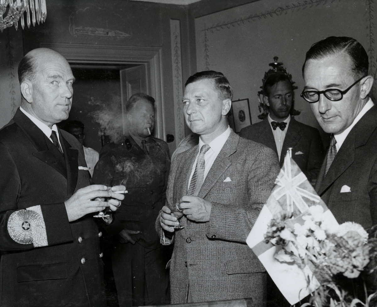 Konteramiral Berthelsson står inne i en lokal tillsammans med två civilklädda militärer i kostymer. I bakgrunden syns fler uniformsklädda män. I förgrunden i nedre högre hörnet syns blommor och en äldre Engelsk flagga med Union Jack i ena övre hörnet.