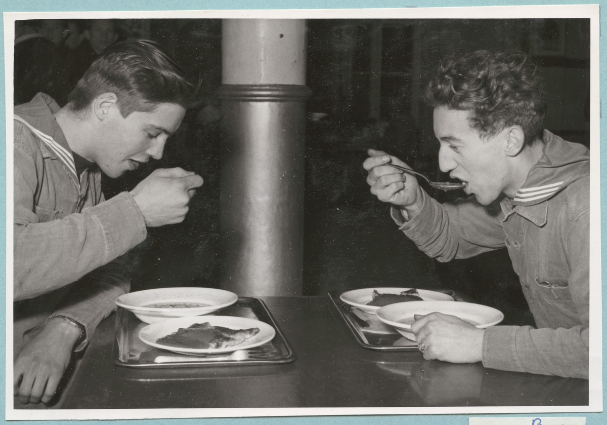 Två uniformsklädda flottister sitter vid ett matbord och äter. Framför sig har de varsin bricka med en skål ärtsoppa och en tallrick med pannkakor.