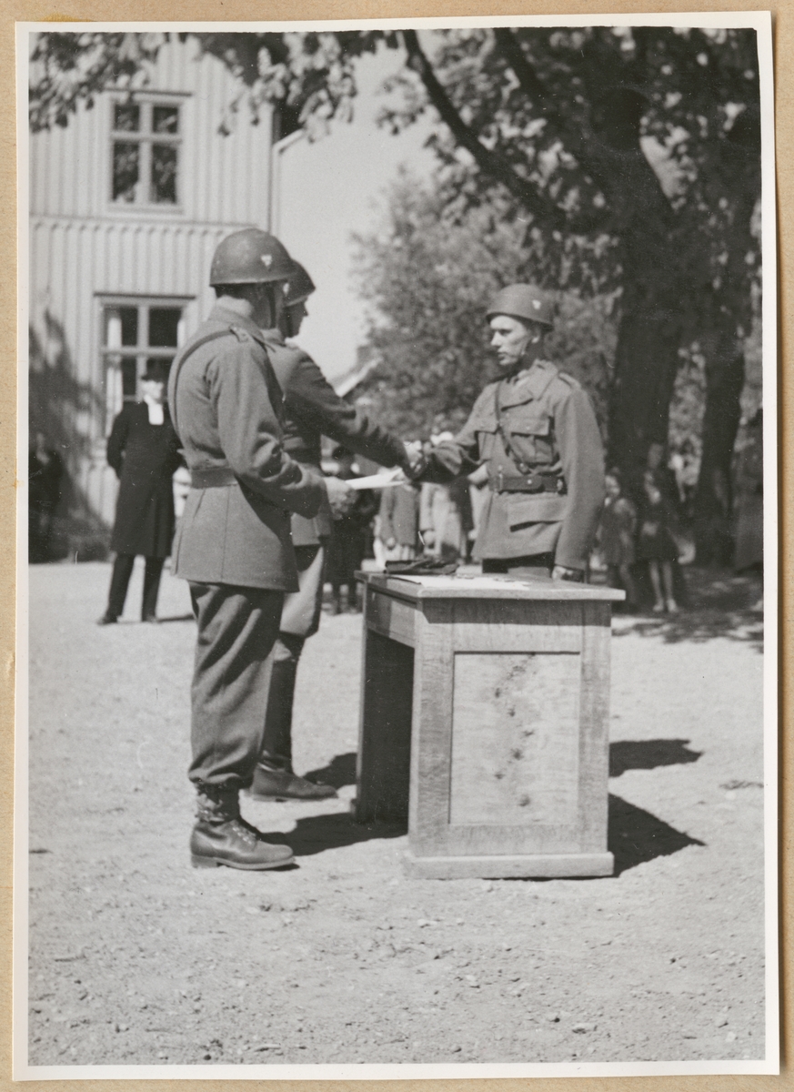 Två uniformsklädda soldater står vid ett skrivbord på grusplanen utanför Jämjö Kyrkskola och överräcker ett pris till en tredje soldat.