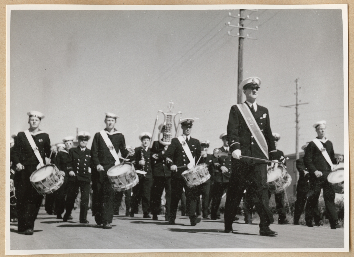 Marinens musikkår på marsch. Främst syns dirigenten, bakom honom första raden trumslagare.