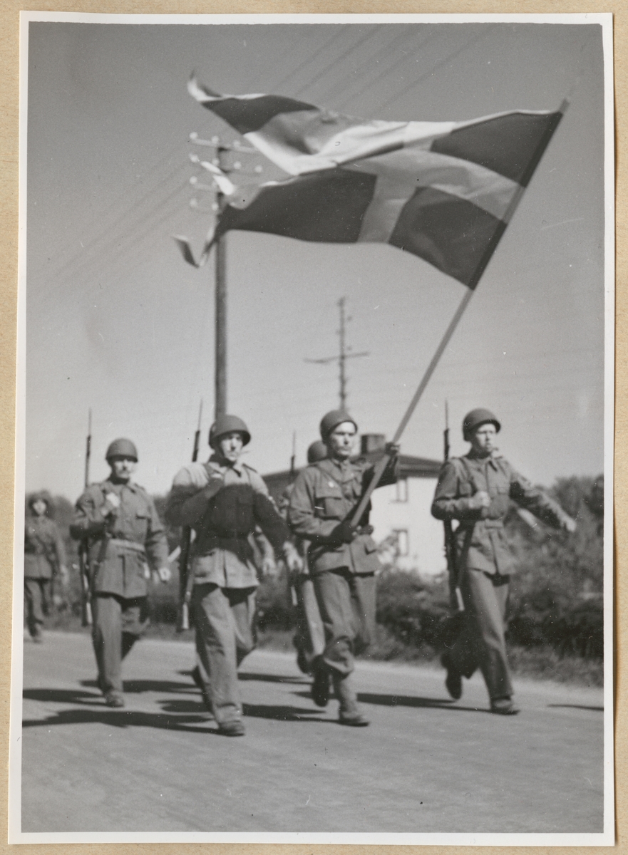 Uniformsklädda soldater utrustade med hjälmar och skjutvapen marscherar på en gata. En av männen håller i en svensk flagga.