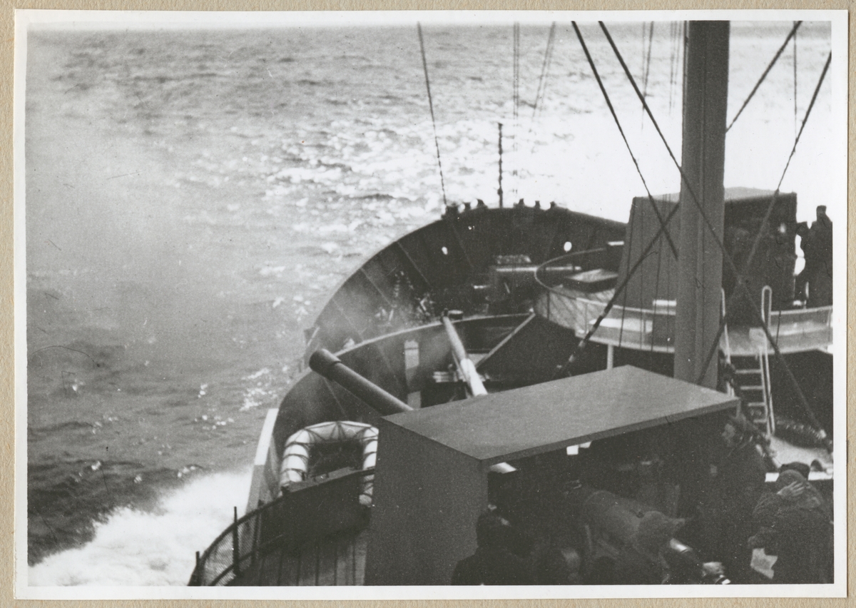Bilden visar fören på ett örlogsfartyg som precis avlossat en kanon. I det nedre högra hörnet syns en grupp män varav en håller för öronen.