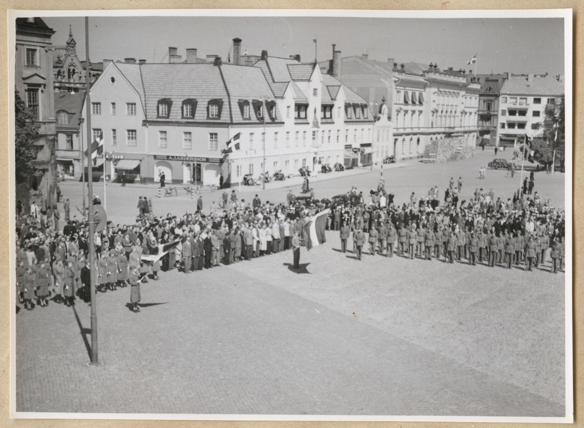 Soldater, lottor och civilklädda människor uppställda på stortorget i Karlskrona. Längst fram står två personer som håller i varsin svensk flagga. I bakgrunden syns kringliggande bebyggelse, bl.a. Karlskrona stadshotell.