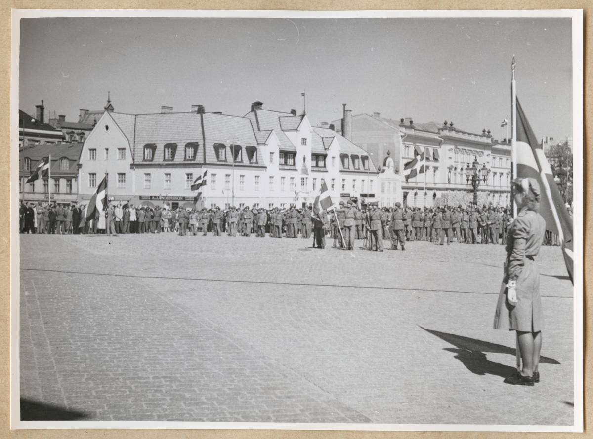 Lottor, soldater och hemvärnssoldater står uppställda på stortorget i Karlskrona. Till höger i förgrunden syns en lotta som håller i en svensk flagga. I bakgrunden syns byggnader runt stortorget, bland annat Karlskrona stadshotell.