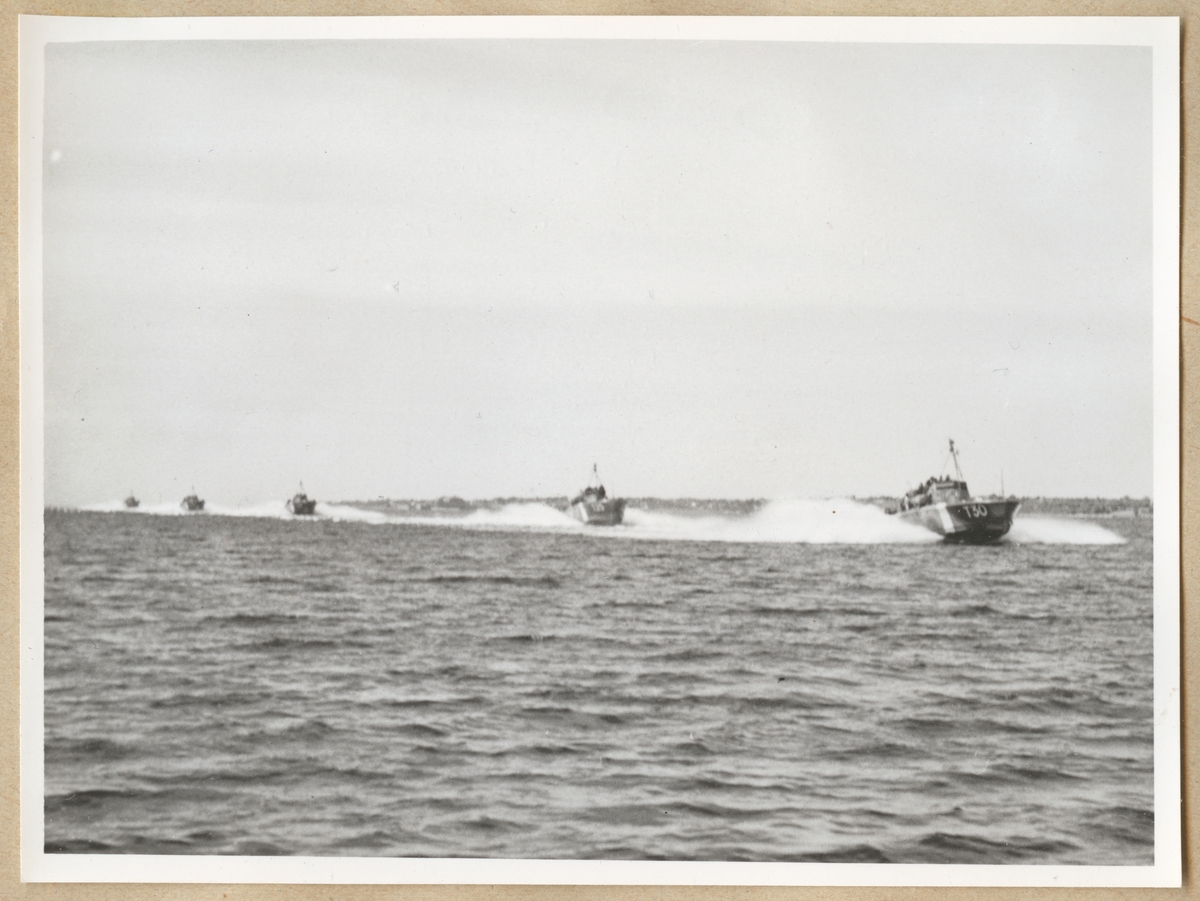 Fem motortorpedbåtar färdas i hög fart över havet. I täten syns T 30, senare omdöpt till Alex.