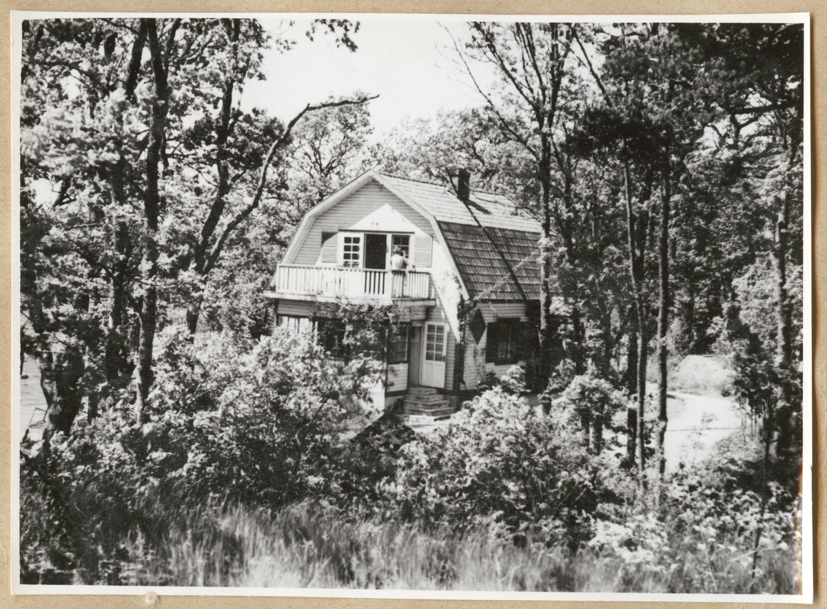 Villa med fasader klädda med liggande panel. Taket utgörs av ett mansardtak som täcks av tegelpannor. På gaveln syns en inglasad veranda med en överliggande balkong. På balkongen står en person. Villan omgärdas av riktlig växtlighet i from av träd och buskar.