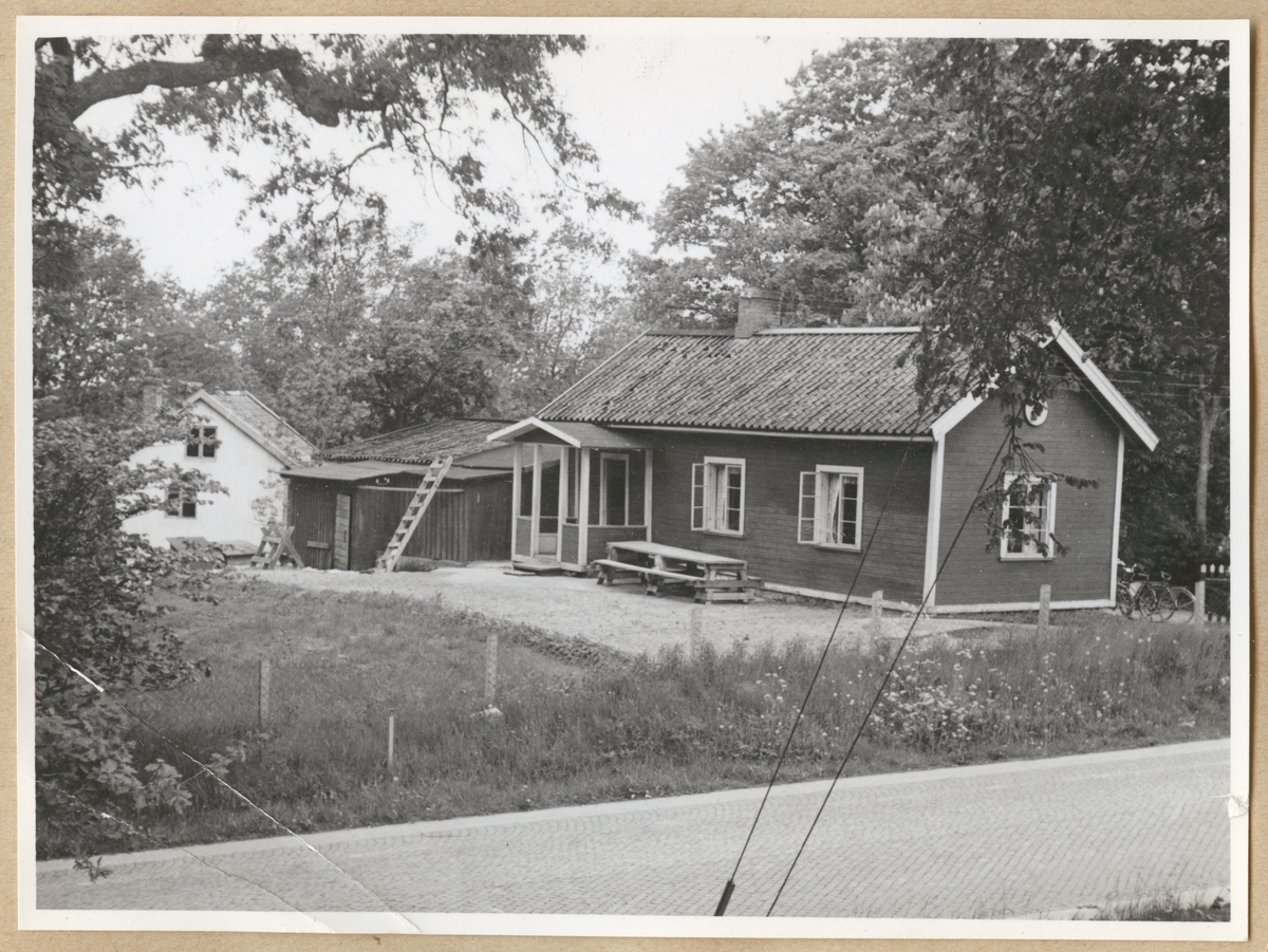Stuga i en våning med fasader klädda med liggande panel. Fönstren består av två lufter spröjsade i tre rutor vardera. Entrén nås via en mindre veranda. Taket är utformat som ett sadeltak och täcks av tegelpannor. Framför byggnaden står ett bord med bänkar. I förgrunden går en väg. Vid sidan om huset skymtar ett enklare uthus samt en större villa i två våningar.