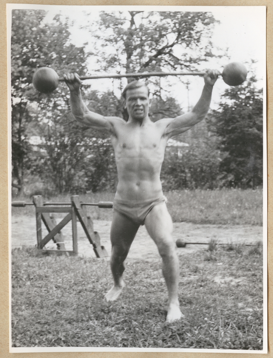 En man klädd i träningsunderkläder lyfter en viktstång över huvudet inför kameran. I bakgrunden syns ytterligare träningsredskap. Scenen är utomhus och i bakgrunden skymtar träd och buskar.