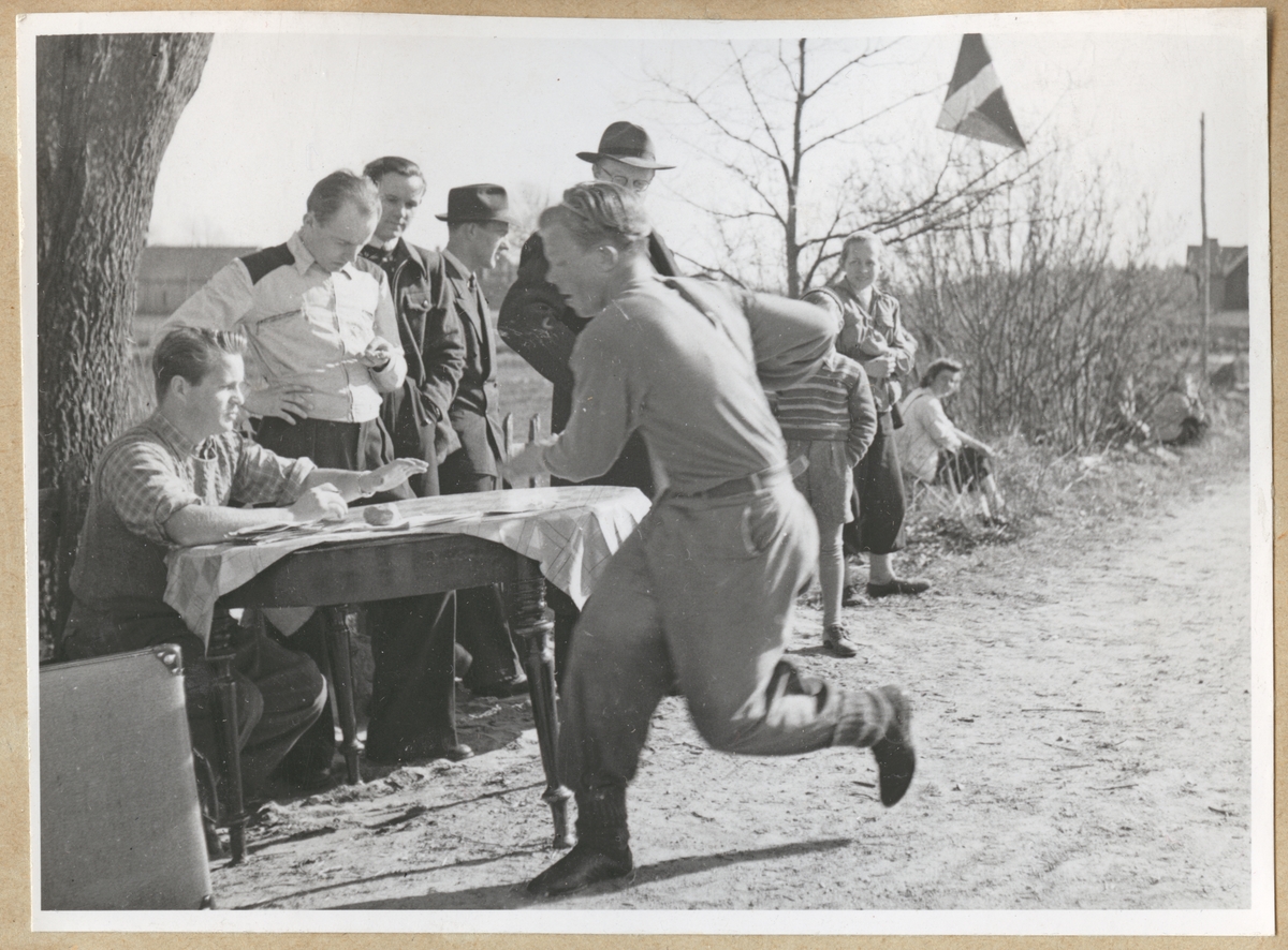 Invid en grusväg sitter en man vid ett rundat träbord med en duk på. Bredvid bordet, längs med grusvägen, står en grupp människor bestående av män, kvinnor och barn. På grusvägen springer en ung man förbi bordet och den lilla folksamlingen.