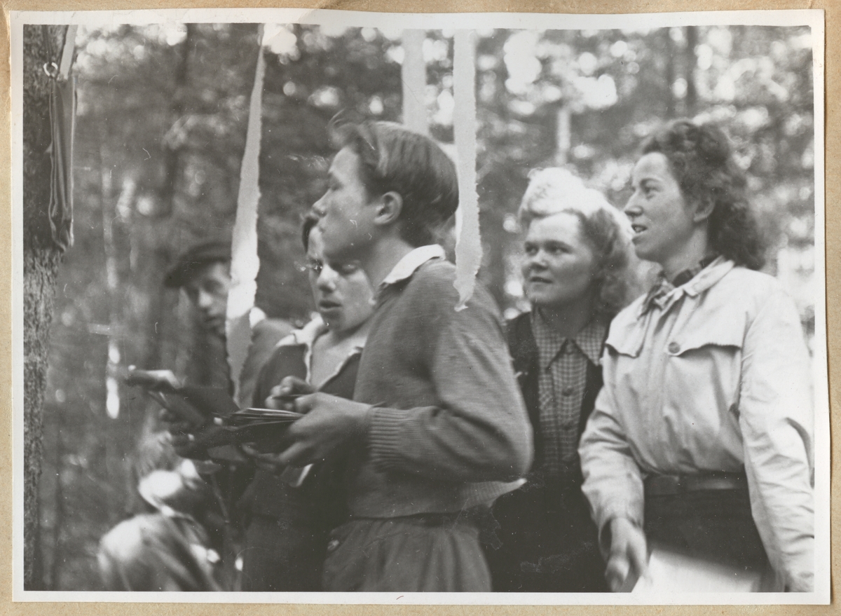 Två unga män och två unga kvinnor står samlade i en grupp i skogen och tittar på ett föremål som är upphängt på ett träd, troligen en orienteringskontroll. I bakgrunden skymtar en något äldre man.